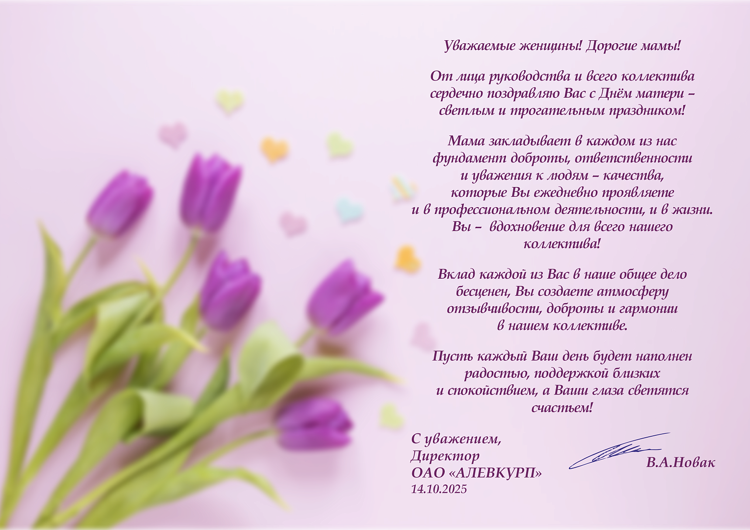 Кіраўніцтва ААТ «АЛЕВКУРП» і першасная прафсаюзная арганізацыя Таварыства павіншавалі цудоўную палову калектыву з Днём маці.Гэтае цудоўнае свята было зацверджана ў Беларусі ў 1996 годзе, і з таго часу стала сапраўды ўсенародным. У гэты дзень мы аддаём даніну павагі і падзякі нашым самым блізкім і дарагім жанчынам. Менавіта разуменне і падтрымка маці дапамагае нам дасягаць поспехаў, а таксама спраўляцца з цяжкасцямі.
